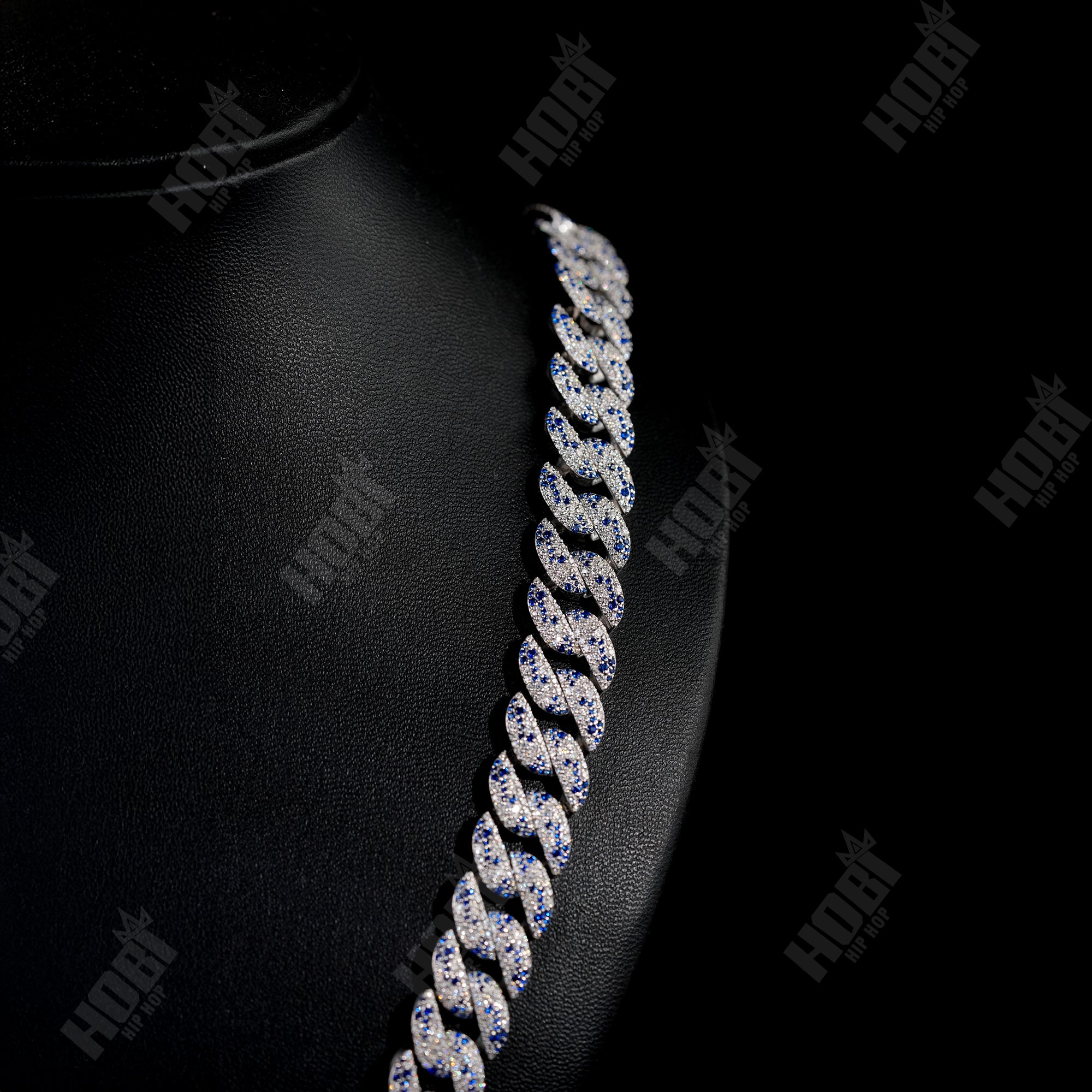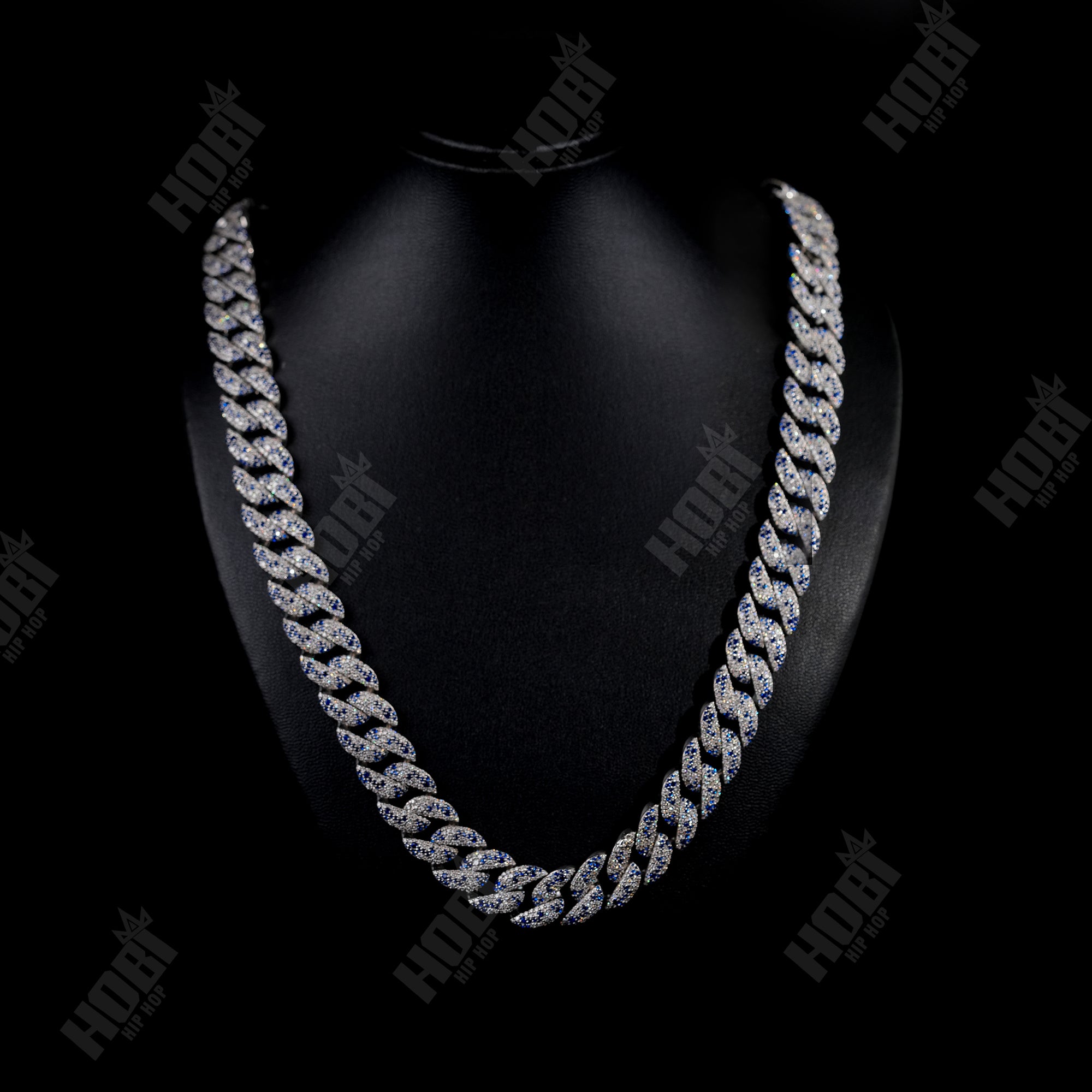 Two-Tone Blue & White Diamond Cuban Chain This striking Cuban link chain combines classic design with contemporary elegance. Crafted with alternating blue and white diamond accents, each link showcases precision-cut stones that catch light beautifully. The two-tone finish adds depth and visual interest, making it versatile enough for both casual and formal occasions. The robust Cuban link construction ensures durability and longevity, while the diamond detailing elevates the piece to statement jewelry status. Perfect for layering or wearing solo, this chain delivers timeless sophistication with modern flair.